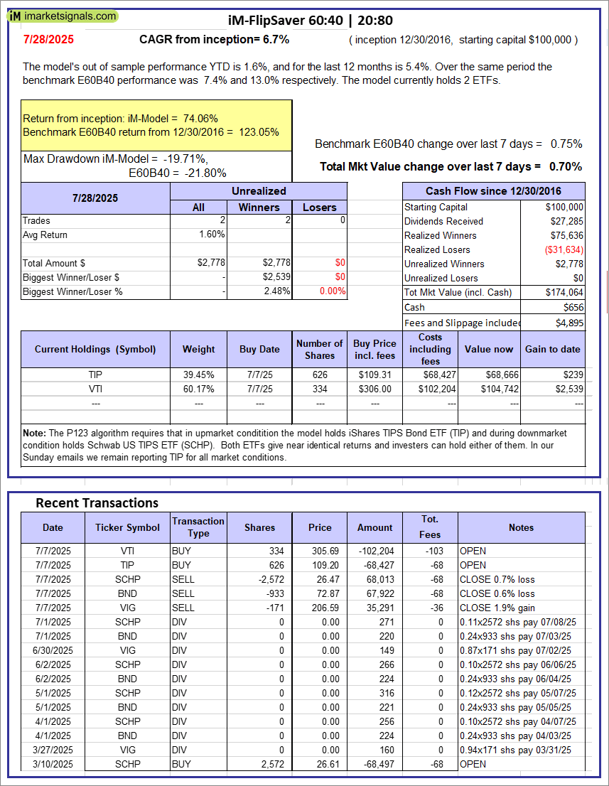 iM-FlipSaver 60:40 | 20:80 – 2017: The model’s out of sample performance YTD is 1.6%, and for the last 12 months is 5.4%. Over the same period the benchmark E60B40 performance was 7.4% and 13.0% respectively. Over the previous week the market value of iM-FlipSaver 80:20 | 20:80 gained 0.70% at a time when SPY gained 0.75%. A starting capital of $100,000 at inception on 7/16/2015 would have grown to $174,064 which includes $656 cash and excludes $4,895 spent on fees and slippage. |