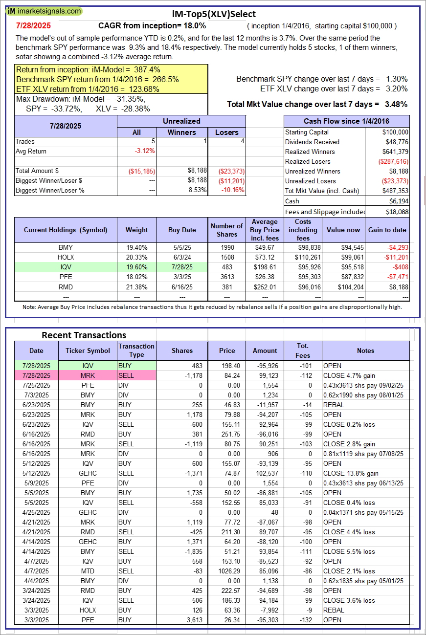 iM-Top5(XLV)Select: Since inception, on 1/5/2016, the model gained 387.35% while the benchmark SPY gained 266.52% over the same period. Over the previous week the market value of iM-Top5(XLV)Select gained 3.48% at a time when SPY gained 1.30%. A starting capital of $100,000 at inception on 1/5/2016 would have grown to $487,353 which includes $6,194 cash and excludes $18,088 spent on fees and slippage. |