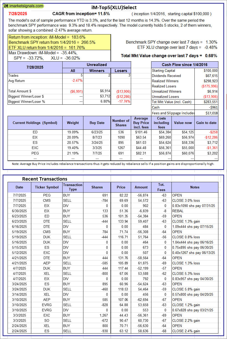 iM-Top5(XLU)Select: Since inception, on 1/5/2016, the model gained 183.55% while the benchmark SPY gained 266.52% over the same period. Over the previous week the market value of iM-Top5(XLU)Select gained 0.68% at a time when SPY gained 1.30%. A starting capital of $100,000 at inception on 1/5/2016 would have grown to $283,551 which includes -$961 cash and excludes $17,018 spent on fees and slippage. |