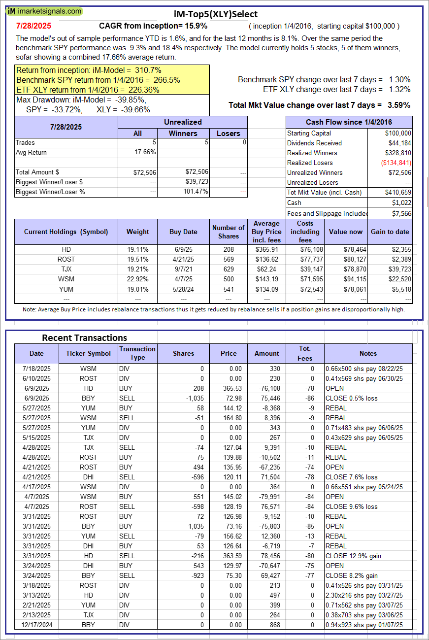 iM-Top5(XLY)Select: Since inception, on 1/5/2016, the model gained 310.66% while the benchmark SPY gained 266.52% over the same period. Over the previous week the market value of iM-Top5(XLY)Select gained 3.59% at a time when SPY gained 1.30%. A starting capital of $100,000 at inception on 1/5/2016 would have grown to $410,659 which includes $1,022 cash and excludes $7,566 spent on fees and slippage. |