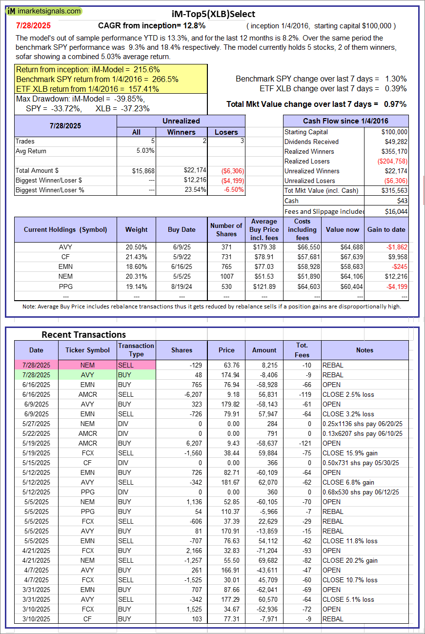 iM-Top5(XLB)Select: Since inception, on 1/5/2016, the model gained 215.56% while the benchmark SPY gained 266.52% over the same period. Over the previous week the market value of iM-Top5(XLB)Select gained 0.97% at a time when SPY gained 1.30%. A starting capital of $100,000 at inception on 1/5/2016 would have grown to $315,563 which includes $43 cash and excludes $16,044 spent on fees and slippage. |