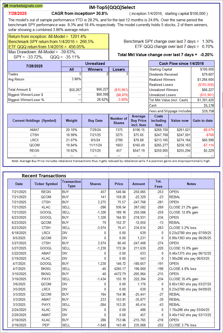 iM-Top5(QQQ)Select: Since inception, on 1/5/2016, the model gained 1201.42% while the benchmark SPY gained 266.52% over the same period. Over the previous week the market value of iM-Top5(QQQ)Select gained -0.20% at a time when SPY gained 1.30%. A starting capital of $100,000 at inception on 1/5/2016 would have grown to $1,301,420 which includes $5,178 cash and excludes $19,758 spent on fees and slippage. |