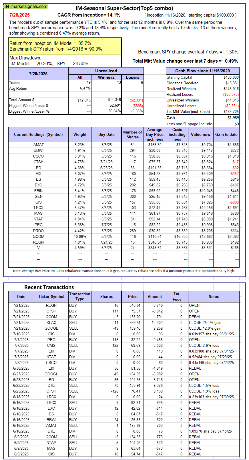 iM-Seasonal Super-Sectors (Top5 combo) : Since inception, on 11/17/2020, the model gained 85.70% while the benchmark SPY gained 90.26% over the same period. Over the previous week the market value of iM-Seasonal Super-Sectors (Top5 combo) gained 0.49% at a time when SPY gained 1.30%. A starting capital of $100,000 at inception on 11/17/2020 would have grown to $185,705 which includes $1,989 cash and excludes $00 spent on fees and slippage. |