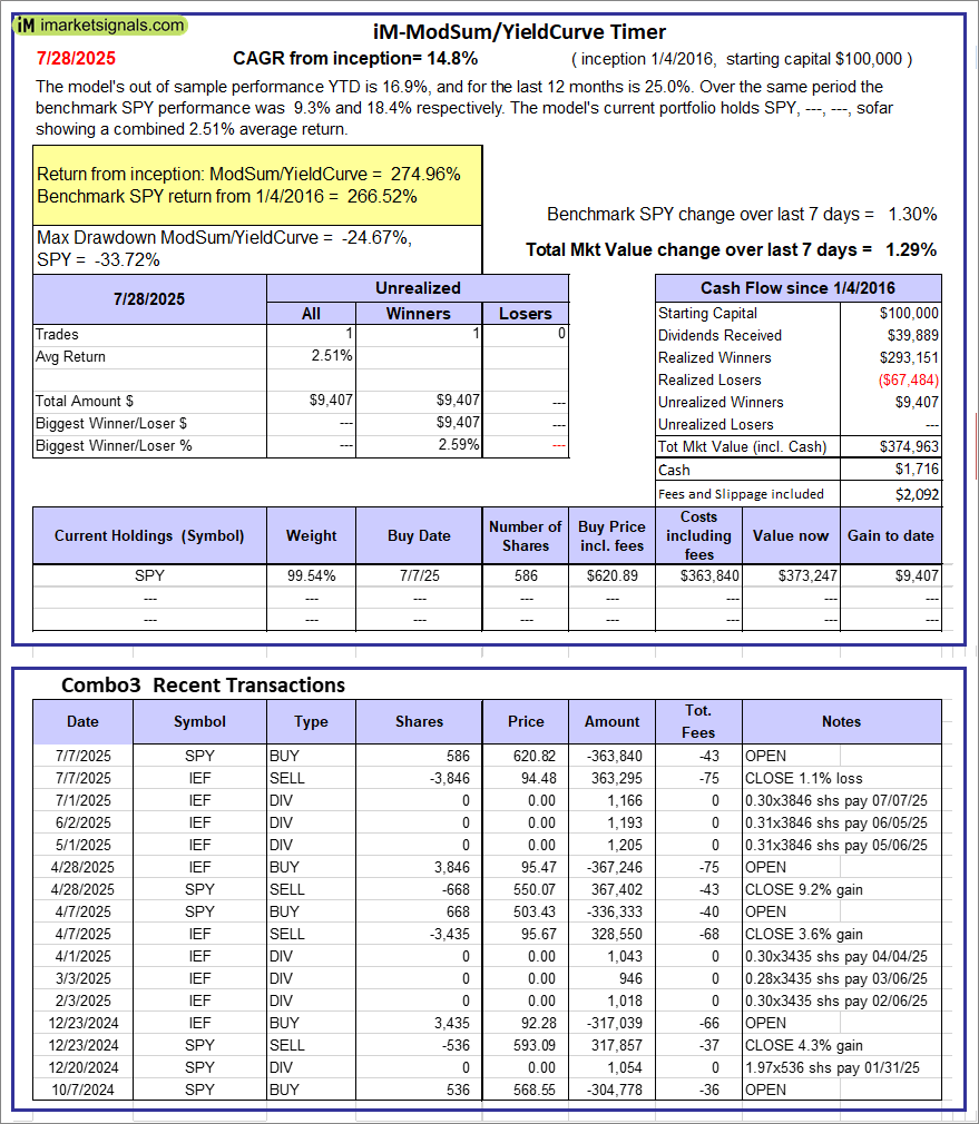 iM-ModSum/YieldCurve Timer: The model’s out of sample performance YTD is 16.9%, and for the last 12 months is 25.0%. Over the same period the benchmark SPY performance was 9.3% and 18.4% respectively. Over the previous week the market value of iM-PortSum/YieldCurve Timer gained 1.29% at a time when SPY gained 1.30%. A starting capital of $100,000 at inception on 1/1/2016 would have grown to $374,963 which includes $1,716 cash and excludes $2,092 spent on fees and slippage. |