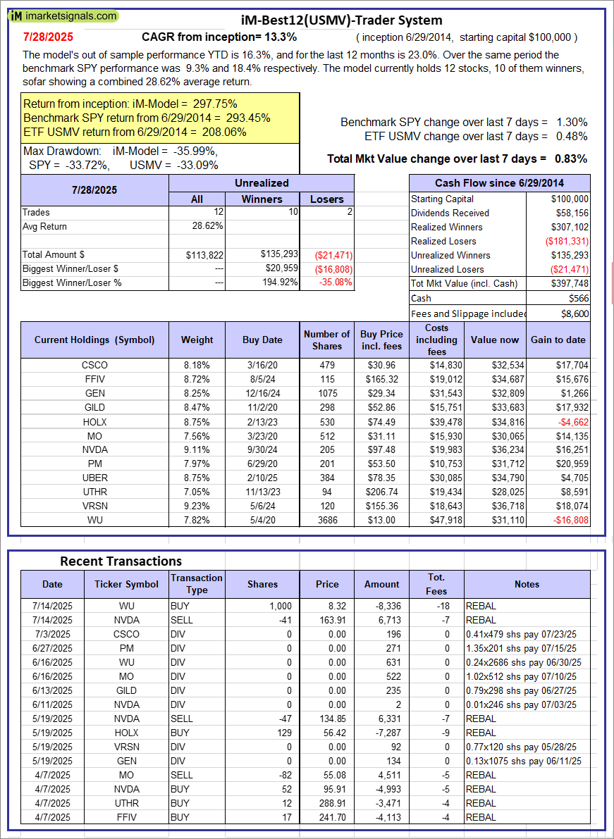 iM-Best12(USMV)-Trader: The model’s out of sample performance YTD is 16.3%, and for the last 12 months is 23.0%. Over the same period the benchmark SPY performance was 9.3% and 18.4% respectively. Since inception, on 6/30/2014, the model gained 297.75% while the benchmark SPY gained 293.45% and the ETF USMV gained 208.06% over the same period. Over the previous week the market value of iM-Best12(USMV)-Trader gained 0.83% at a time when SPY gained 1.30%. A starting capital of $100,000 at inception on 6/30/2014 would have grown to $397,748 which includes $566 cash and excludes $8,600 spent on fees and slippage. |