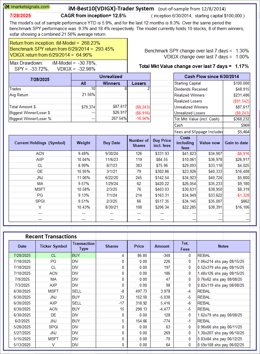 iM-Best10(VDIGX)-Trader: The model’s out of sample performance YTD is 5.9%, and for the last 12 months is 9.3%. Over the same period the benchmark SPY performance was 9.3% and 18.4% respectively. Since inception, on 7/1/2014, the model gained 268.23% while the benchmark SPY gained 293.45% and VDIGX gained 64.96% over the same period. Over the previous week the market value of iM-Best10(VDIGX) gained 1.17% at a time when SPY gained 1.30%. A starting capital of $100,000 at inception on 7/1/2014 would have grown to $368,232 which includes $969 cash and excludes $5,464 spent on fees and slippage. |