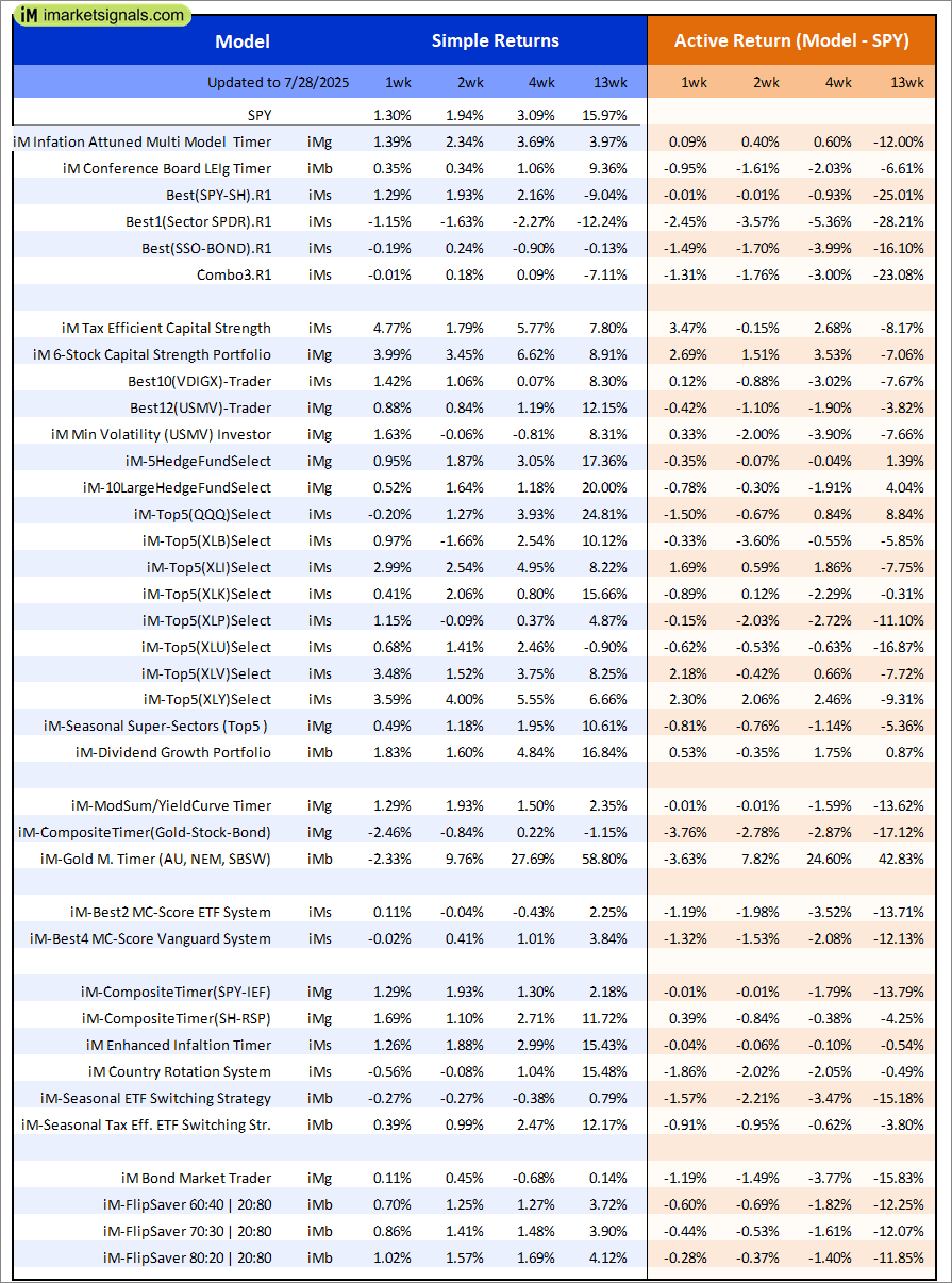 iM-Composite (SPY-IEF) Timer: The model’s out of sample performance YTD is -1.3%, and for the last 12 months is 3.9%. Over the same period the benchmark SPY performance was 9.3% and 18.4% respectively. Over the previous week the market value of the iM-Composite (SPY-IEF) Timer gained 1.29% at a time when SPY gained 1.30%. A starting capital of $100,000 at inception on 6/30/2016 would have grown to $212,377 which includes $913 cash and excludes $7,786 spent on fees and slippage. |