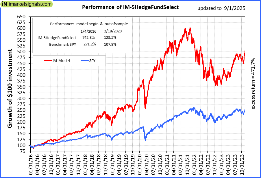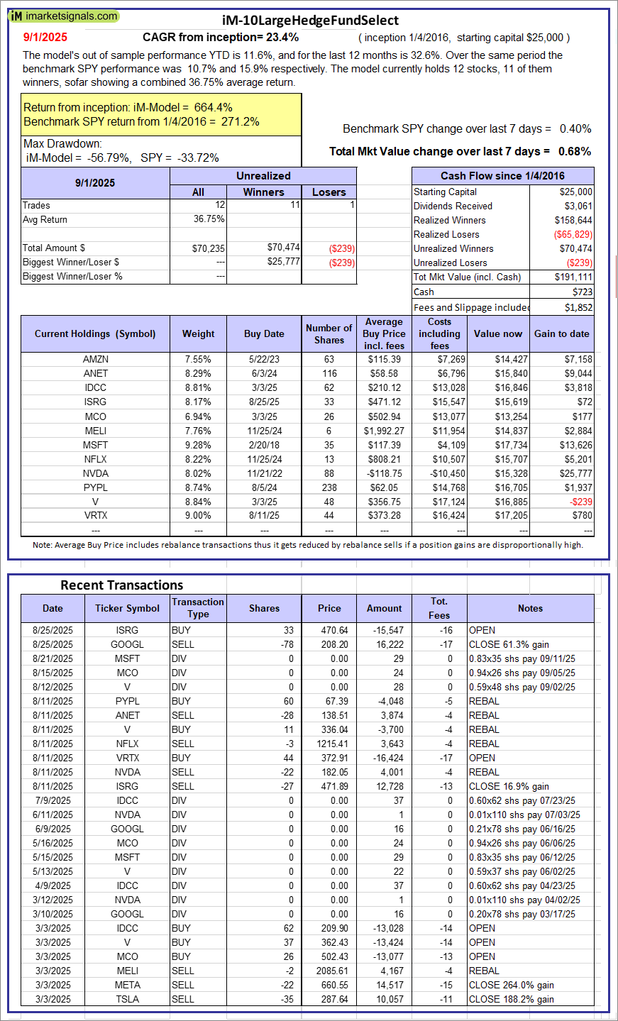 iM-10LargeHedgeFundSelect: Since inception, on 1/5/2016, the model gained 664.44% while the benchmark SPY gained 271.19% over the same period. Over the previous week the market value of iM-10LargeHedgeFundSelect gained 0.68% at a time when SPY gained 0.40%. A starting capital of $25,000 at inception on 1/5/2016 would have grown to $191,111 which includes $723 cash and excludes $1,852 spent on fees and slippage. |