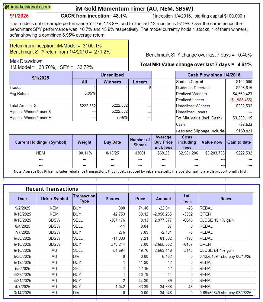 iM-Gold Momentum Timer (AU, NEM, SBSW): The model’s out of sample performance YTD is 173.8%, and for the last 12 months is 97.9%. Over the same period the benchmark SPY performance was 10.7% and 15.9% respectively. Over the previous week the market value of iM-Gold Momentum Timer (AU, NEM, SBSW) gained 4.61% at a time when SPY gained 0.40%. A starting capital of $100,000 at inception on 6/30/2016 would have grown to -$3,623 which includes $160,821 cash and excludes Gain to date spent on fees and slippage. |