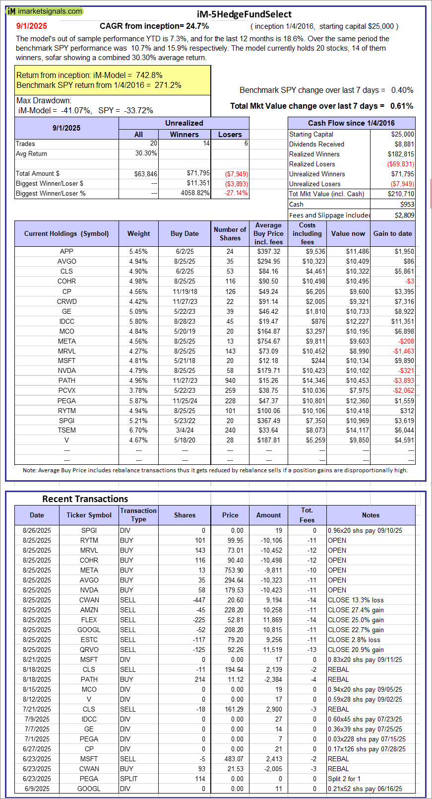iM-5HedgeFundSelect: Since inception, on 1/5/2016, the model gained 742.84% while the benchmark SPY gained 271.19% over the same period. Over the previous week the market value of iM-5HedgeFundSelect gained 0.61% at a time when SPY gained 0.40%. A starting capital of $25,000 at inception on 1/5/2016 would have grown to $210,710 which includes $953 cash and excludes $2,809 spent on fees and slippage. |