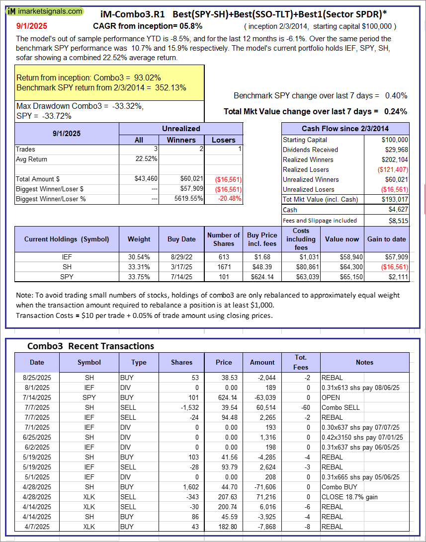 iM-Combo3.R1: The model’s out of sample performance YTD is -8.5%, and for the last 12 months is -6.1%. Over the same period the benchmark SPY performance was 10.7% and 15.9% respectively. Over the previous week the market value of iM-Combo3.R1 gained 0.24% at a time when SPY gained 0.40%. A starting capital of $100,000 at inception on 2/3/2014 would have grown to $193,017 which includes $4,627 cash and excludes $8,515 spent on fees and slippage. |