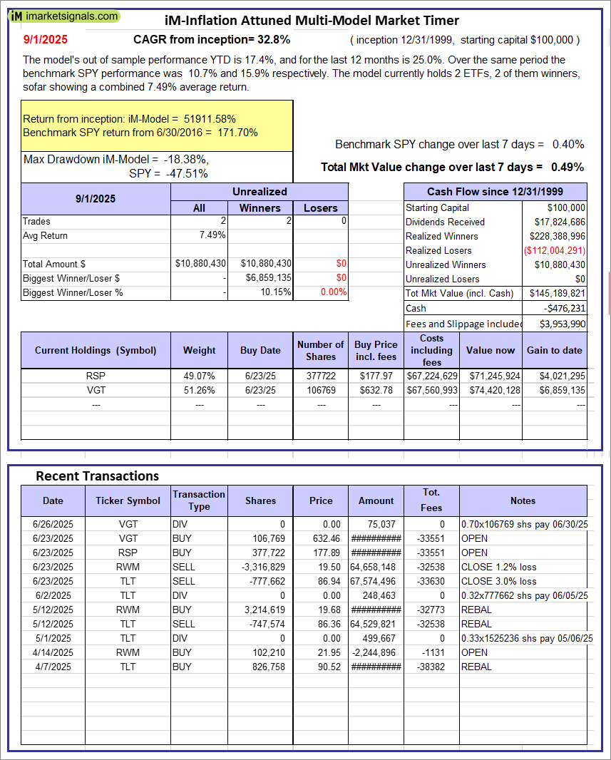iM-Inflation Attuned Multi-Model Market Timer: The model’s out of sample performance YTD is 17.4%, and for the last 12 months is 25.0%. Over the same period the benchmark SPY performance was 10.7% and 15.9% respectively. Over the previous week the market value of the iM-Inflation Attuned Multi-Model Market Timer gained 0.49% at a time when SPY gained 0.40%. A starting capital of $100,000 at inception on 3/24/2017 would have grown to $145,189,821 which includes -$476,231 cash and excludes $3,953,990 spent on fees and slippage. |