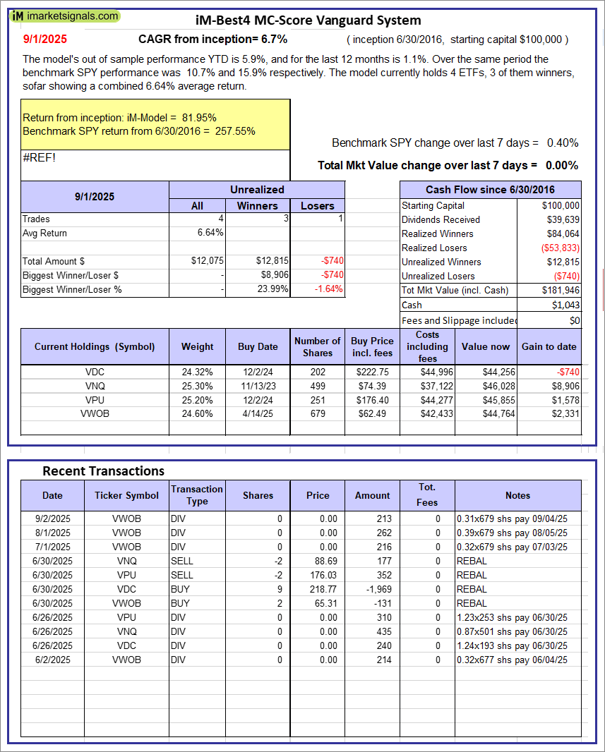 iM-Best4 MC-Score Vanguard System: The model’s out of sample performance YTD is 5.9%, and for the last 12 months is 1.1%. Over the same period the benchmark SPY performance was 10.7% and 15.9% respectively. Over the previous week the market value of the iM-Best4 MC-Score Vanguard System gained 0.00% at a time when SPY gained 0.40%. A starting capital of $100,000 at inception on 6/30/2016 would have grown to $181,946 which includes $1,043 cash and excludes $00 spent on fees and slippage. |