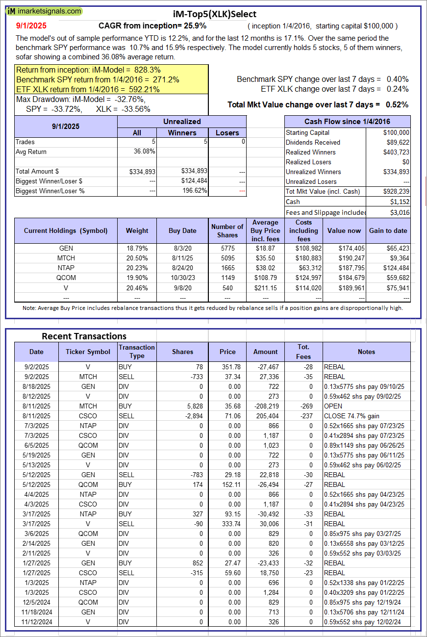 iM-Top5(XLK)Select: Since inception, on 1/5/2016, the model gained 828.30% while the benchmark SPY gained 271.19% over the same period. Over the previous week the market value of iM-Top5(XLK)Select gained 0.52% at a time when SPY gained 0.40%. A starting capital of $100,000 at inception on 1/5/2016 would have grown to $928,239 which includes $1,152 cash and excludes $3,016 spent on fees and slippage. |