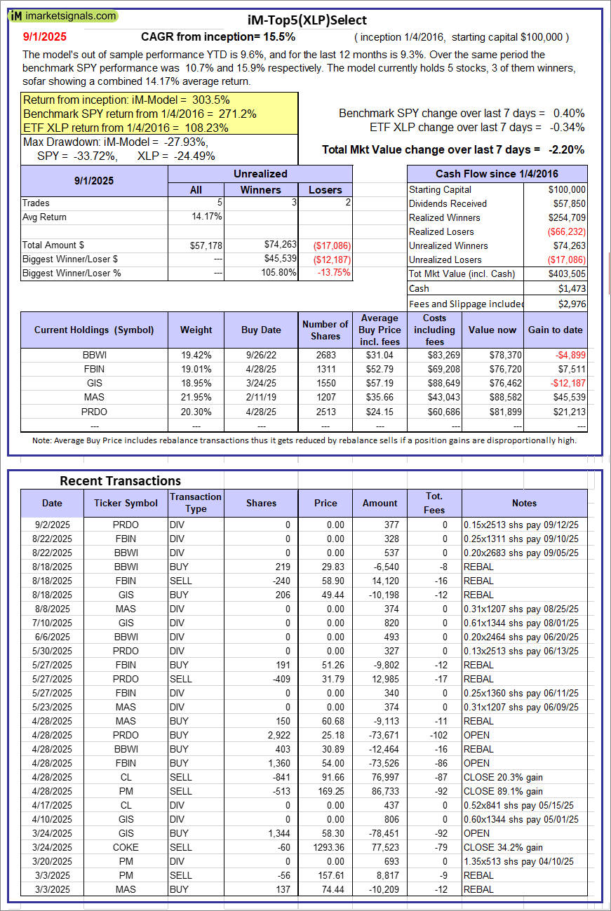 iM-Top5(XLP)Select: Since inception, on 1/5/2016, the model gained 303.51% while the benchmark SPY gained 271.19% over the same period. Over the previous week the market value of iM-Top5(XLP)Select gained -2.20% at a time when SPY gained 0.40%. A starting capital of $100,000 at inception on 1/5/2016 would have grown to $403,505 which includes $1,473 cash and excludes $2,976 spent on fees and slippage. |