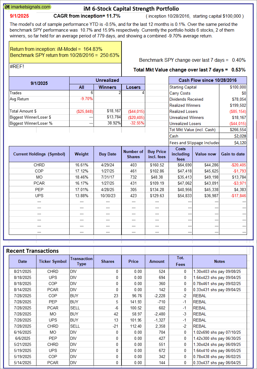 iM 6-Stock Capital Strength Portfolio: The model’s out of sample performance YTD is -0.5%, and for the last 12 months is 0.1%. Over the same period the benchmark SPY performance was 10.7% and 15.9% respectively. Over the previous week the market value of the iM 6-Stock Capital Strength Portfolio gained 0.53% at a time when SPY gained 0.40%. A starting capital of $100,000 at inception on 10/28/2016 would have grown to $266,554 which includes $2,028 cash and excludes $4,120 spent on fees and slippage. |