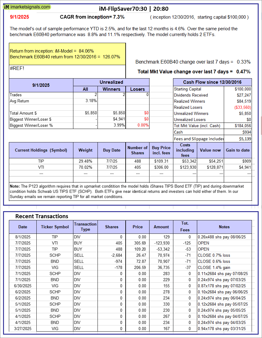 iM-FlipSaver 70:30 | 20:80 – 2017: The model’s out of sample performance YTD is 2.5%, and for the last 12 months is 4.6%. Over the same period the benchmark E60B40 performance was 8.8% and 11.1% respectively. Over the previous week the market value of iM-FlipSaver 70:30 | 20:80 gained 0.47% at a time when SPY gained 0.33%. A starting capital of $100,000 at inception on 7/15/2015 would have grown to $184,056 which includes $934 cash and excludes $5,139 spent on fees and slippage. |
