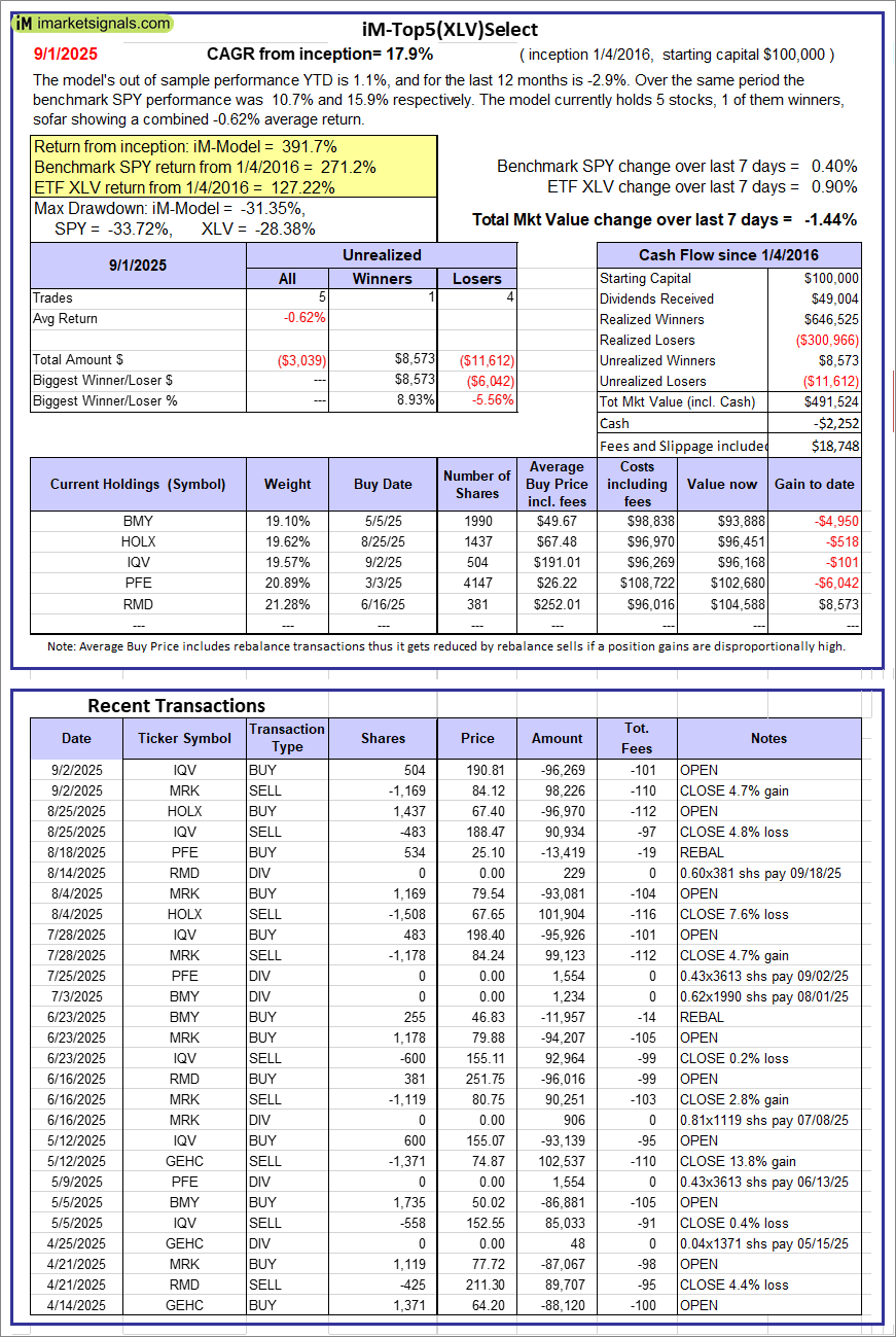 iM-Top5(XLV)Select: Since inception, on 1/5/2016, the model gained 391.74% while the benchmark SPY gained 271.19% over the same period. Over the previous week the market value of iM-Top5(XLV)Select gained -1.44% at a time when SPY gained 0.40%. A starting capital of $100,000 at inception on 1/5/2016 would have grown to $491,524 which includes -$2,252 cash and excludes $18,748 spent on fees and slippage. |