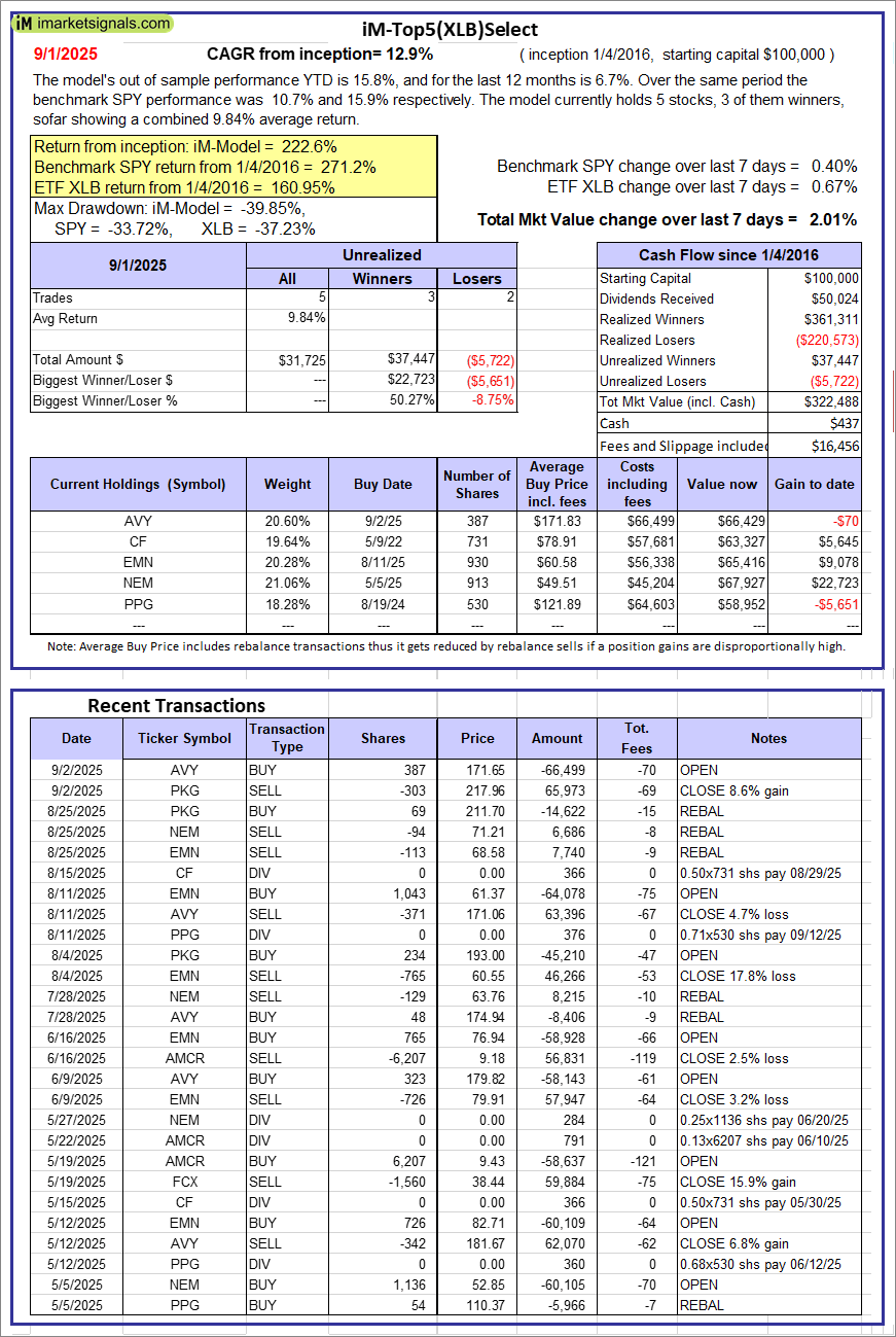 iM-Top5(XLB)Select: Since inception, on 1/5/2016, the model gained 222.63% while the benchmark SPY gained 271.19% over the same period. Over the previous week the market value of iM-Top5(XLB)Select gained 2.01% at a time when SPY gained 0.40%. A starting capital of $100,000 at inception on 1/5/2016 would have grown to $322,488 which includes $437 cash and excludes $16,456 spent on fees and slippage. |