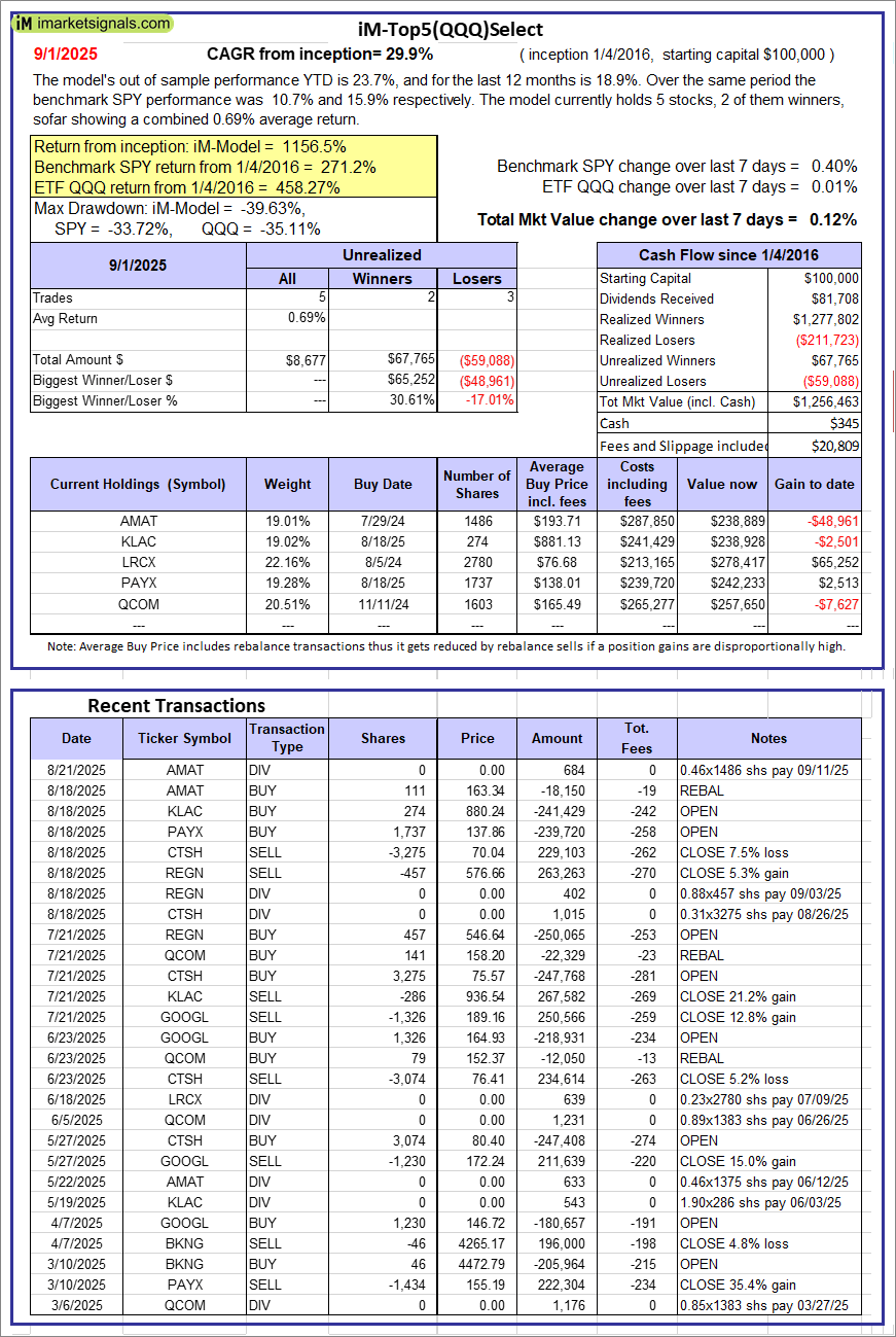 iM-Top5(QQQ)Select: Since inception, on 1/5/2016, the model gained 1156.46% while the benchmark SPY gained 271.19% over the same period. Over the previous week the market value of iM-Top5(QQQ)Select gained 0.12% at a time when SPY gained 0.40%. A starting capital of $100,000 at inception on 1/5/2016 would have grown to $1,256,463 which includes $345 cash and excludes $20,809 spent on fees and slippage. |