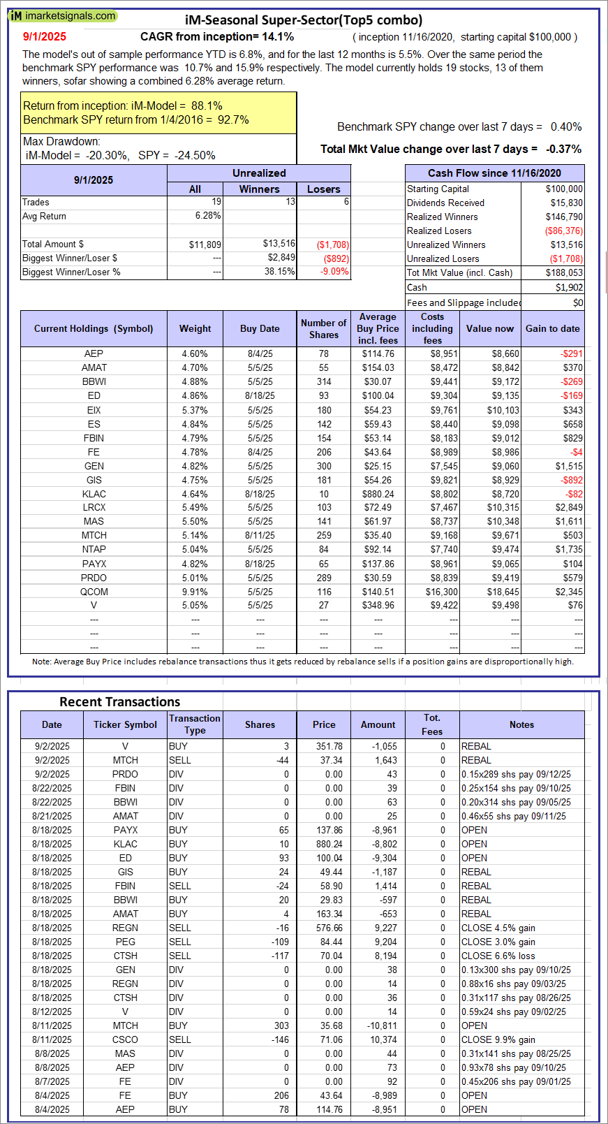 iM-Seasonal Super-Sectors (Top5 combo) : Since inception, on 11/17/2020, the model gained 88.05% while the benchmark SPY gained 92.69% over the same period. Over the previous week the market value of iM-Seasonal Super-Sectors (Top5 combo) gained -0.37% at a time when SPY gained 0.40%. A starting capital of $100,000 at inception on 11/17/2020 would have grown to $188,053 which includes $1,902 cash and excludes $00 spent on fees and slippage. |