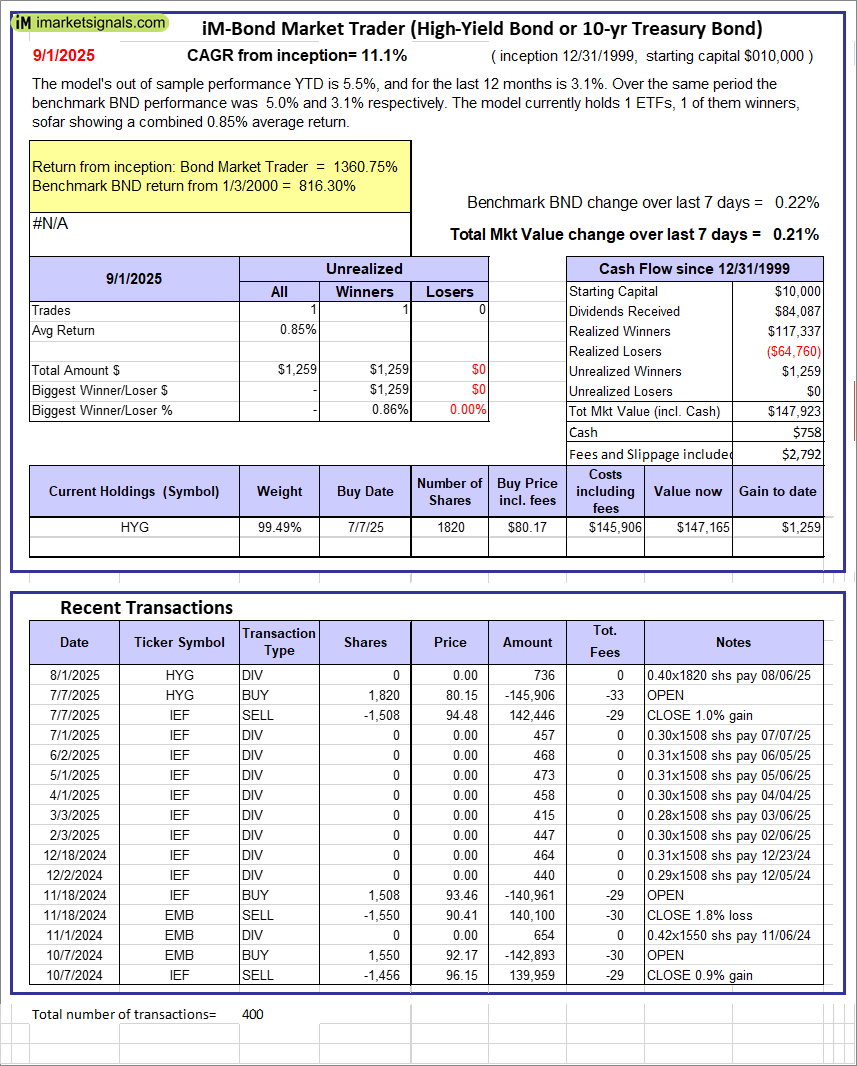 iM-Bond Market Trader (High-Yield Bond or 10-yr Treasury Bond): The model’s out of sample performance YTD is 5.5%, and for the last 12 months is 3.1%. Over the same period the benchmark BND performance was 5.0% and 3.1% respectively. Over the previous week the market value of the iM-Bond Market Trader (High-Yield Bond or 10-yr Treasury Bond) gained 0.21% at a time when BND gained 0.22%. A starting capital of $10,000 at inception on 1/3/2000 would have grown to $147,923 which includes $758 cash and excludes $2,792 spent on fees and slippage. |