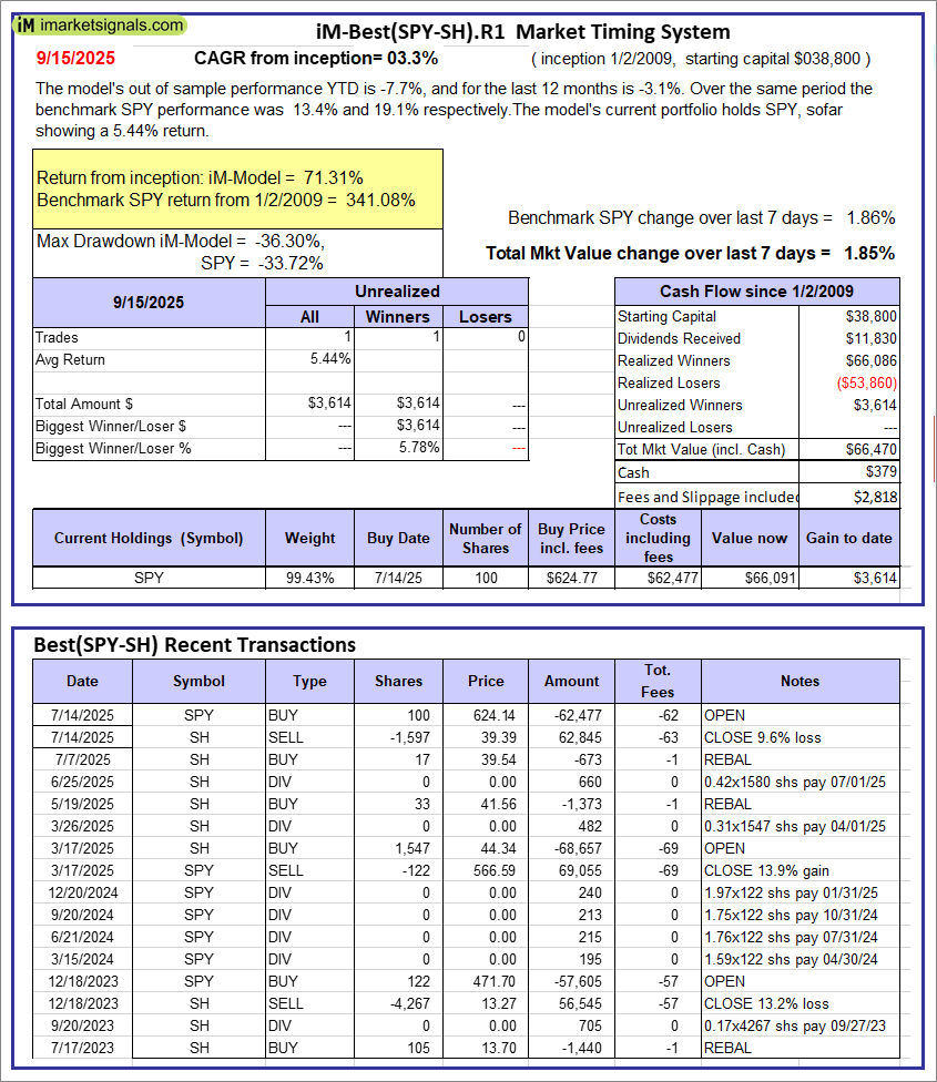 iM-Best(SPY-SH).R1: The model’s out of sample performance YTD is -7.7%, and for the last 12 months is -3.1%. Over the same period the benchmark SPY performance was 13.4% and 19.1% respectively. Over the previous week the market value of Best(SPY-SH) gained 1.85% at a time when SPY gained 1.86%. A starting capital of $100,000 at inception on 1/2/2009 would have grown to $66,470 which includes $379 cash and excludes $2,818 spent on fees and slippage. |