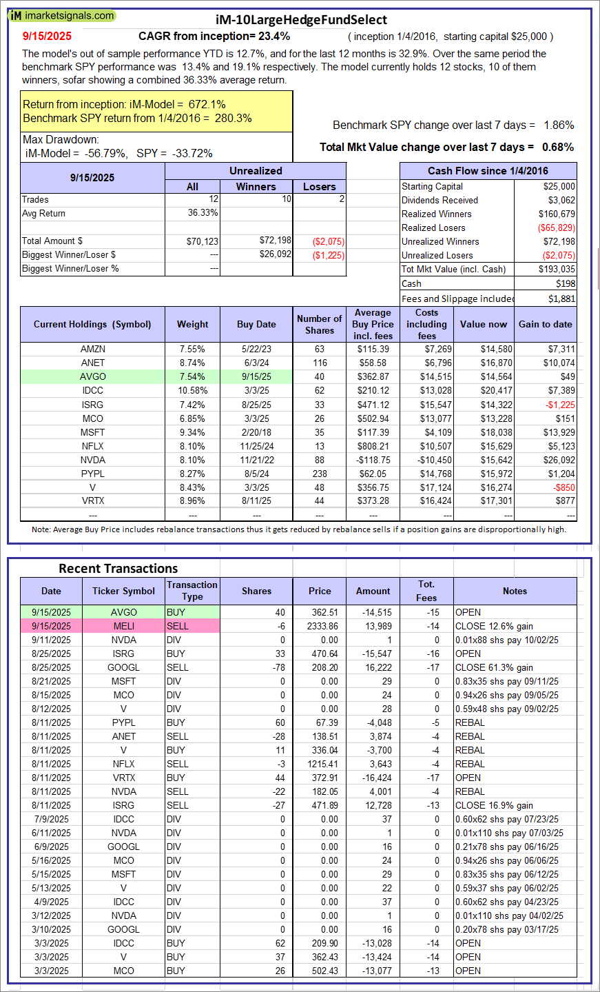 iM-10LargeHedgeFundSelect: Since inception, on 1/5/2016, the model gained 672.14% while the benchmark SPY gained 280.32% over the same period. Over the previous week the market value of iM-10LargeHedgeFundSelect gained 0.68% at a time when SPY gained 1.86%. A starting capital of $25,000 at inception on 1/5/2016 would have grown to $193,035 which includes $198 cash and excludes $1,881 spent on fees and slippage. |