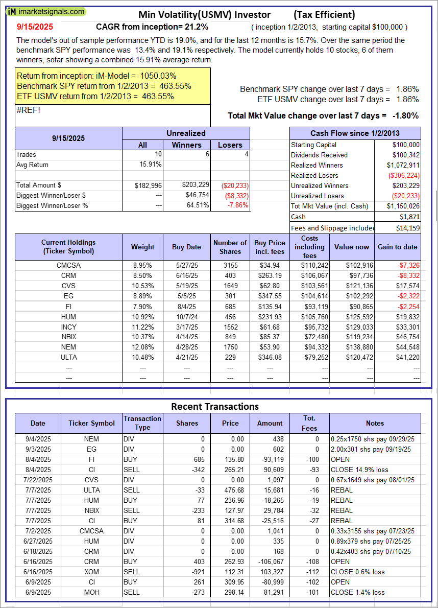 iM-Min Volatility(USMV) Investor (Tax Efficient): The model’s out of sample performance YTD is 19.0%, and for the last 12 months is 15.7%. Over the same period the benchmark SPY performance was 13.4% and 19.1% respectively. Since inception, on 1/3/2013, the model gained 1050.03% while the benchmark SPY gained 463.55% and the ETF USMV gained 463.55% over the same period. Over the previous week the market value of iM-Best12(USMV)Q1 gained -1.80% at a time when SPY gained 1.86%. A starting capital of $100,000 at inception on 1/3/2013 would have grown to $1,150,026 which includes $1,871 cash and excludes $14,159 spent on fees and slippage. |