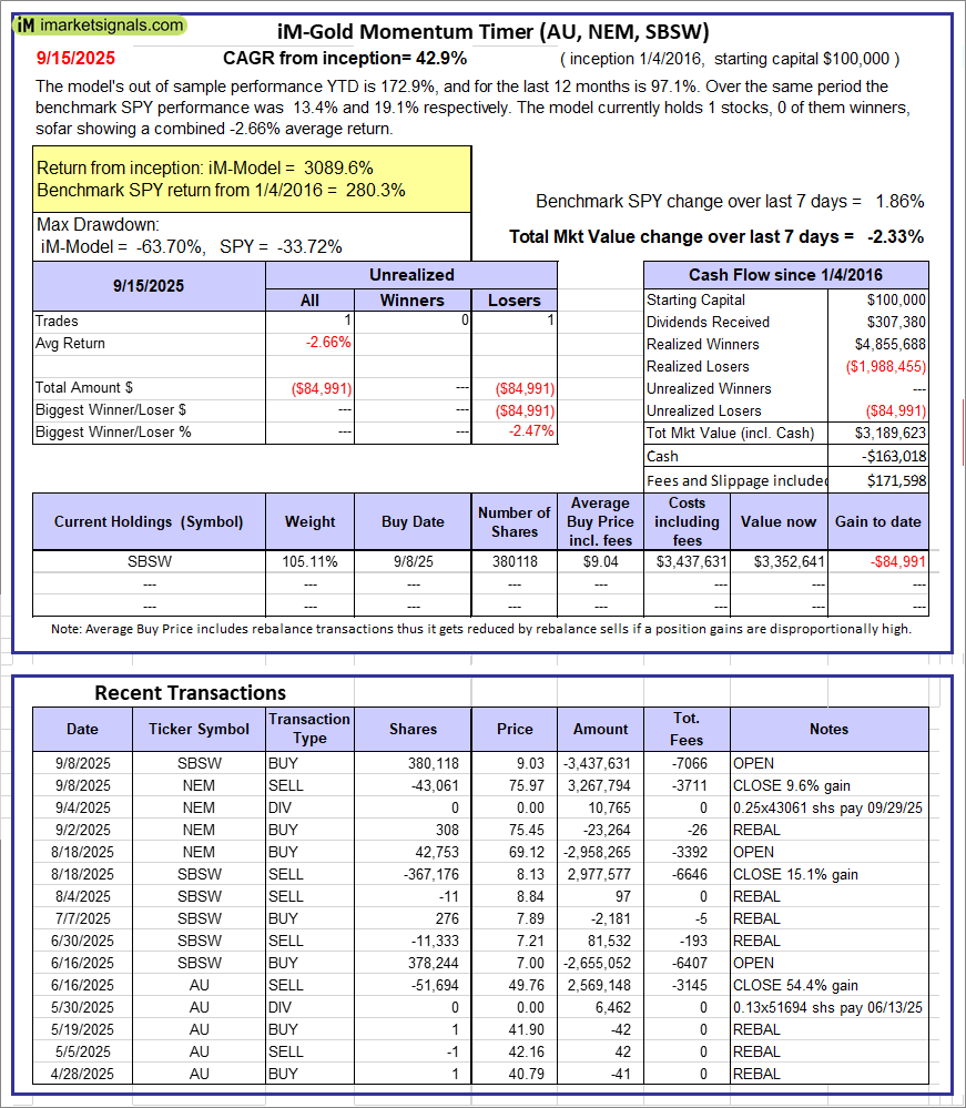 iM-Gold Momentum Timer (AU, NEM, SBSW): The model’s out of sample performance YTD is 172.9%, and for the last 12 months is 97.1%. Over the same period the benchmark SPY performance was 13.4% and 19.1% respectively. Over the previous week the market value of iM-Gold Momentum Timer (AU, NEM, SBSW) gained -2.33% at a time when SPY gained 1.86%. A starting capital of $100,000 at inception on 6/30/2016 would have grown to -$163,018 which includes $171,598 cash and excludes Gain to date spent on fees and slippage. |