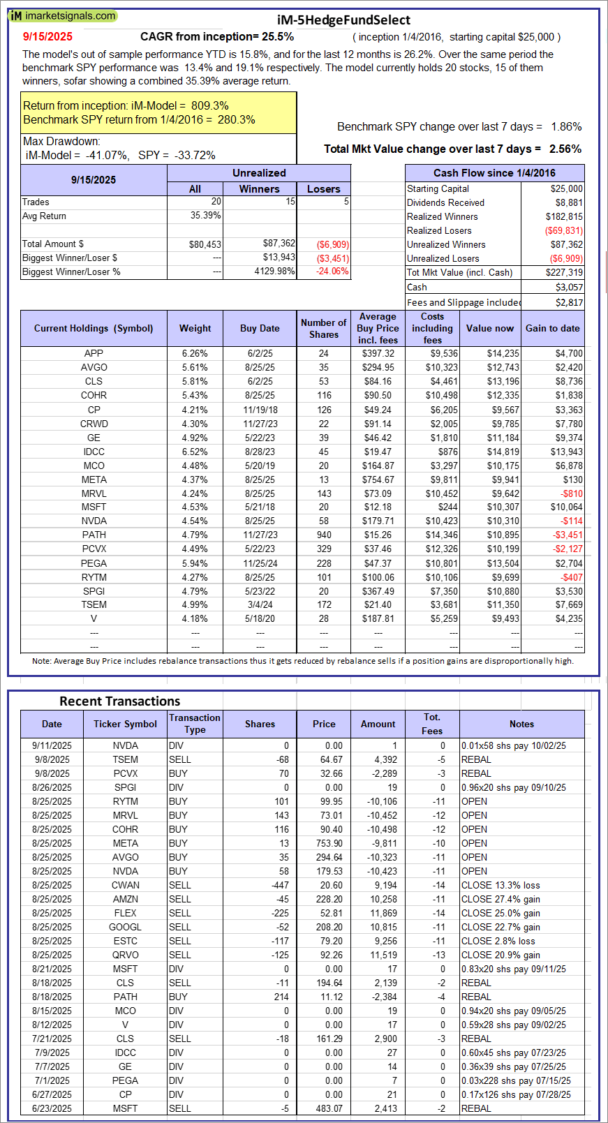 iM-5HedgeFundSelect: Since inception, on 1/5/2016, the model gained 809.27% while the benchmark SPY gained 280.32% over the same period. Over the previous week the market value of iM-5HedgeFundSelect gained 2.56% at a time when SPY gained 1.86%. A starting capital of $25,000 at inception on 1/5/2016 would have grown to $227,319 which includes $3,057 cash and excludes $2,817 spent on fees and slippage. |