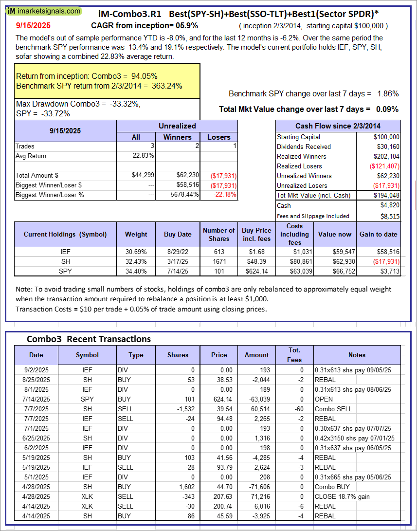 iM-Combo3.R1: The model’s out of sample performance YTD is -8.0%, and for the last 12 months is -6.2%. Over the same period the benchmark SPY performance was 13.4% and 19.1% respectively. Over the previous week the market value of iM-Combo3.R1 gained 0.09% at a time when SPY gained 1.86%. A starting capital of $100,000 at inception on 2/3/2014 would have grown to $194,048 which includes $4,820 cash and excludes $8,515 spent on fees and slippage. |