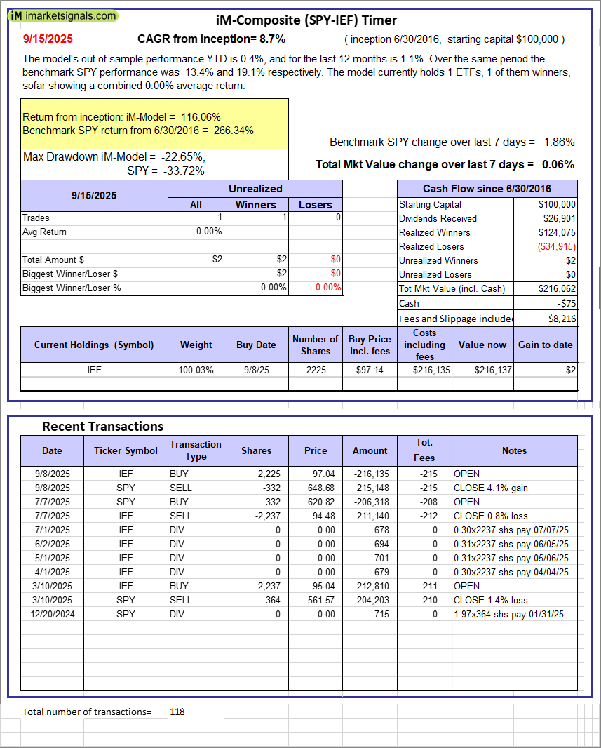 iM-Composite (SPY-IEF) Timer: The model’s out of sample performance YTD is 0.4%, and for the last 12 months is 1.1%. Over the same period the benchmark SPY performance was 13.4% and 19.1% respectively. Over the previous week the market value of the iM-Composite (SPY-IEF) Timer gained 0.06% at a time when SPY gained 1.86%. A starting capital of $100,000 at inception on 6/30/2016 would have grown to $216,062 which includes -$75 cash and excludes $8,216 spent on fees and slippage. |