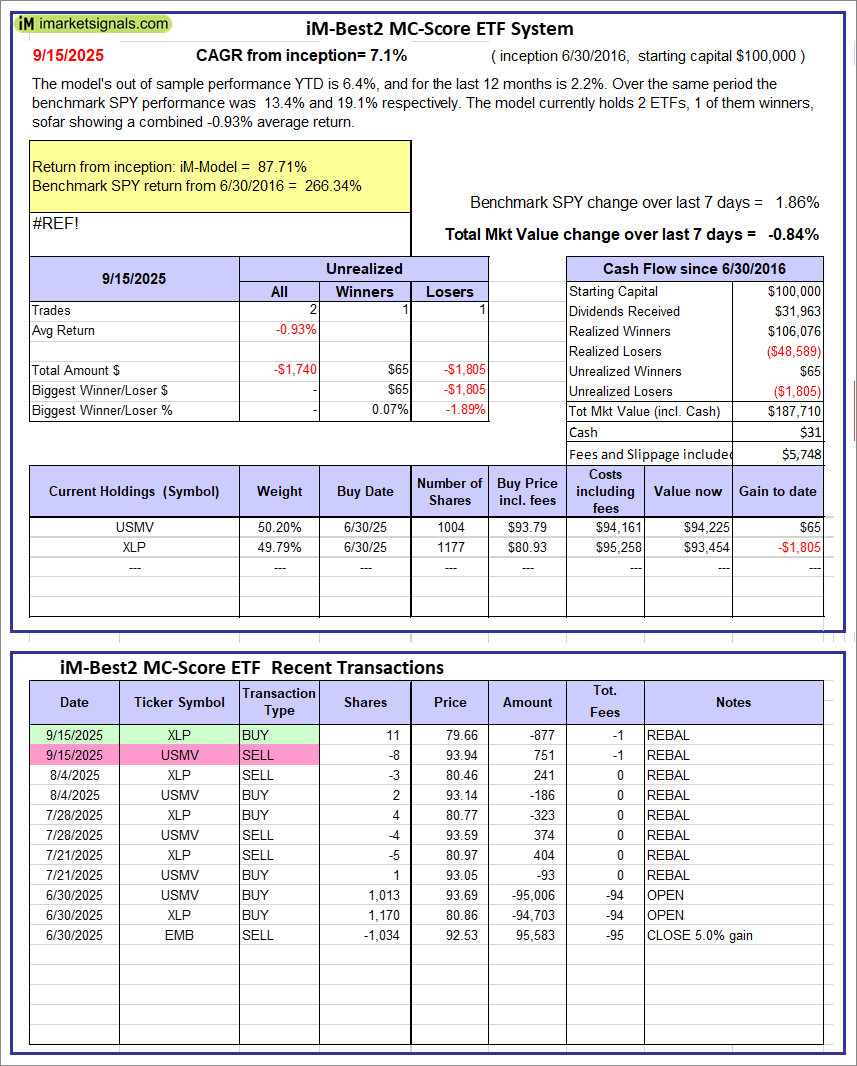 iM-Best2 MC-Score ETF System: The model’s out of sample performance YTD is 6.4%, and for the last 12 months is 2.2%. Over the same period the benchmark SPY performance was 13.4% and 19.1% respectively. Over the previous week the market value of the iM-Best2 MC-Score ETF System gained -0.84% at a time when SPY gained 1.86%. A starting capital of $100,000 at inception on 6/30/2016 would have grown to $187,710 which includes $31 cash and excludes $5,748 spent on fees and slippage. |