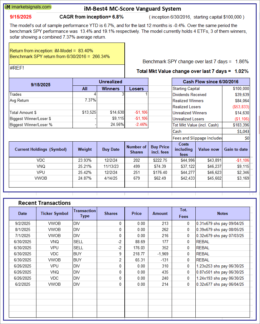 iM-Best4 MC-Score Vanguard System: The model’s out of sample performance YTD is 6.7%, and for the last 12 months is -0.4%. Over the same period the benchmark SPY performance was 13.4% and 19.1% respectively. Over the previous week the market value of the iM-Best4 MC-Score Vanguard System gained 1.02% at a time when SPY gained 1.86%. A starting capital of $100,000 at inception on 6/30/2016 would have grown to $183,396 which includes $1,043 cash and excludes $00 spent on fees and slippage. |