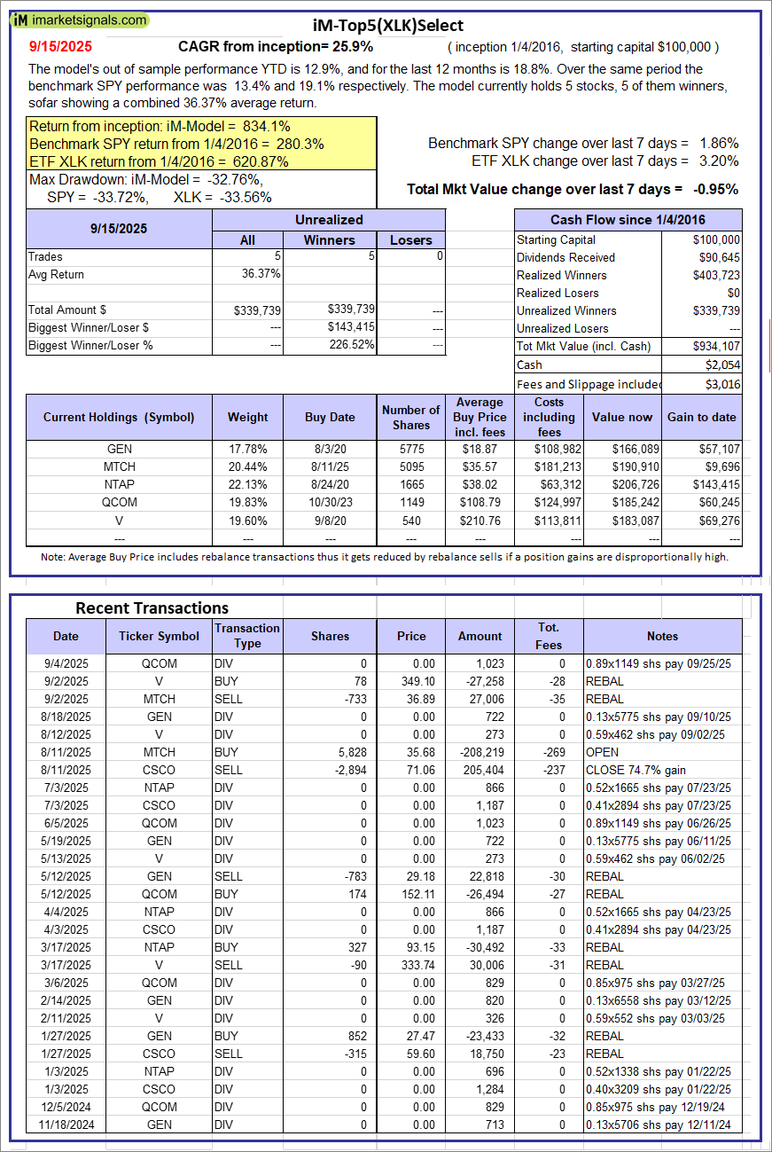 iM-Top5(XLK)Select: Since inception, on 1/5/2016, the model gained 834.11% while the benchmark SPY gained 280.32% over the same period. Over the previous week the market value of iM-Top5(XLK)Select gained -0.95% at a time when SPY gained 1.86%. A starting capital of $100,000 at inception on 1/5/2016 would have grown to $934,107 which includes $2,054 cash and excludes $3,016 spent on fees and slippage. |