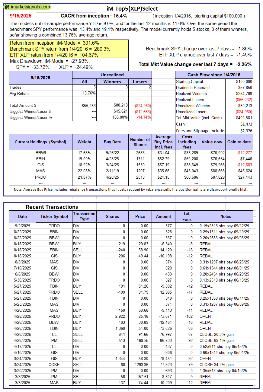 iM-Top5(XLP)Select: Since inception, on 1/5/2016, the model gained 301.58% while the benchmark SPY gained 280.32% over the same period. Over the previous week the market value of iM-Top5(XLP)Select gained -2.26% at a time when SPY gained 1.86%. A starting capital of $100,000 at inception on 1/5/2016 would have grown to $401,581 which includes $1,473 cash and excludes $2,976 spent on fees and slippage. |