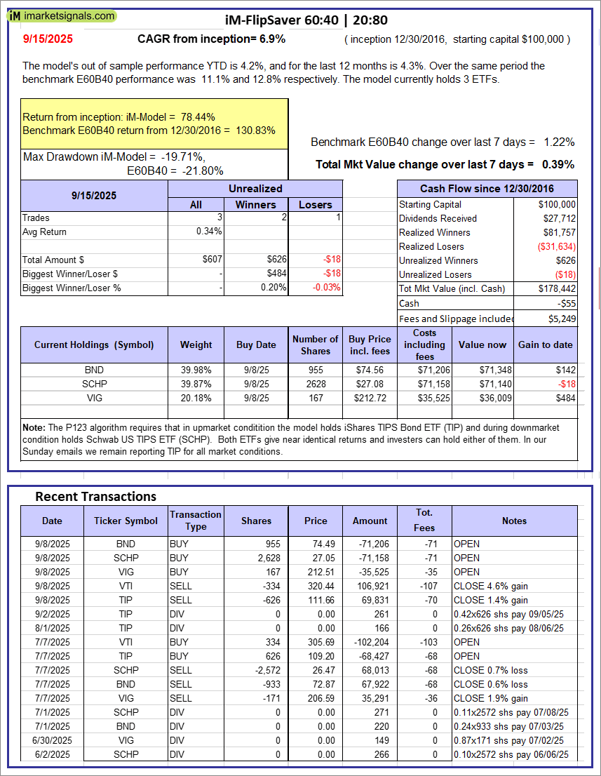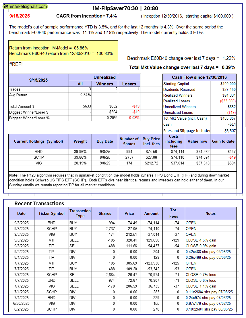 iM-FlipSaver 70:30 | 20:80 – 2017: The model’s out of sample performance YTD is 3.5%, and for the last 12 months is 4.3%. Over the same period the benchmark E60B40 performance was 11.1% and 12.8% respectively. Over the previous week the market value of iM-FlipSaver 70:30 | 20:80 gained 0.39% at a time when SPY gained 1.22%. A starting capital of $100,000 at inception on 7/15/2015 would have grown to $185,857 which includes -$14 cash and excludes $5,507 spent on fees and slippage. |