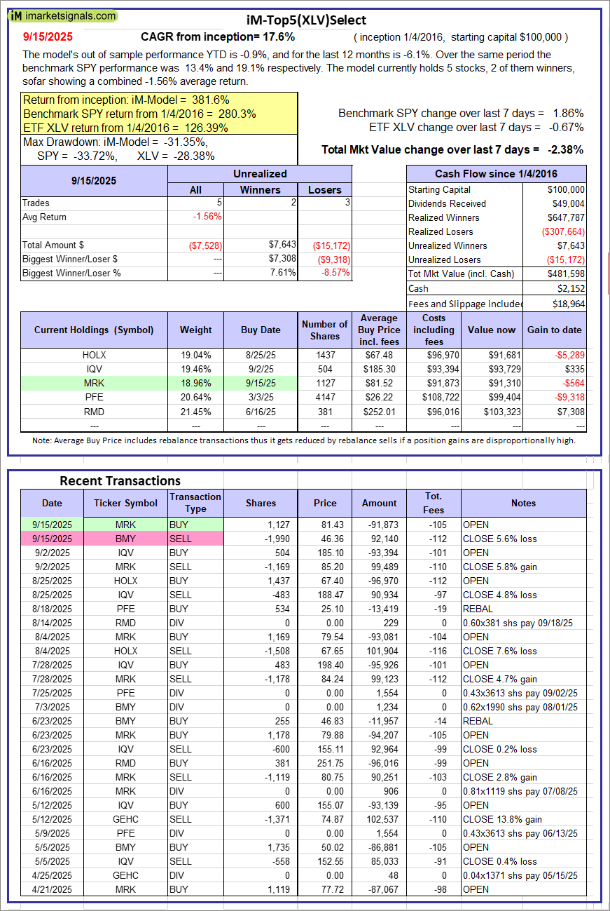iM-Top5(XLV)Select: Since inception, on 1/5/2016, the model gained 381.60% while the benchmark SPY gained 280.32% over the same period. Over the previous week the market value of iM-Top5(XLV)Select gained -2.38% at a time when SPY gained 1.86%. A starting capital of $100,000 at inception on 1/5/2016 would have grown to $481,598 which includes $2,152 cash and excludes $18,964 spent on fees and slippage. |