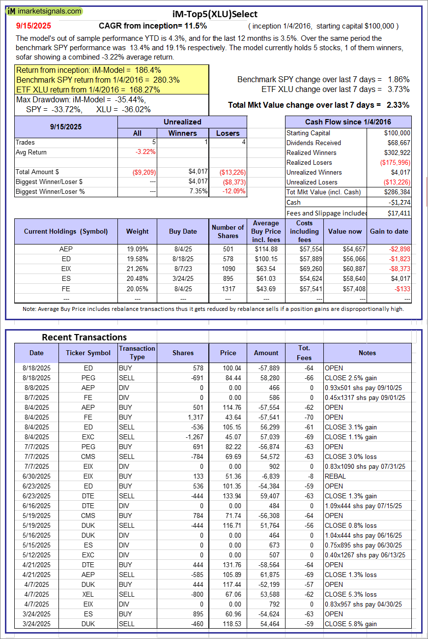 iM-Top5(XLU)Select: Since inception, on 1/5/2016, the model gained 186.38% while the benchmark SPY gained 280.32% over the same period. Over the previous week the market value of iM-Top5(XLU)Select gained 2.33% at a time when SPY gained 1.86%. A starting capital of $100,000 at inception on 1/5/2016 would have grown to $286,384 which includes -$1,274 cash and excludes $17,411 spent on fees and slippage. |
