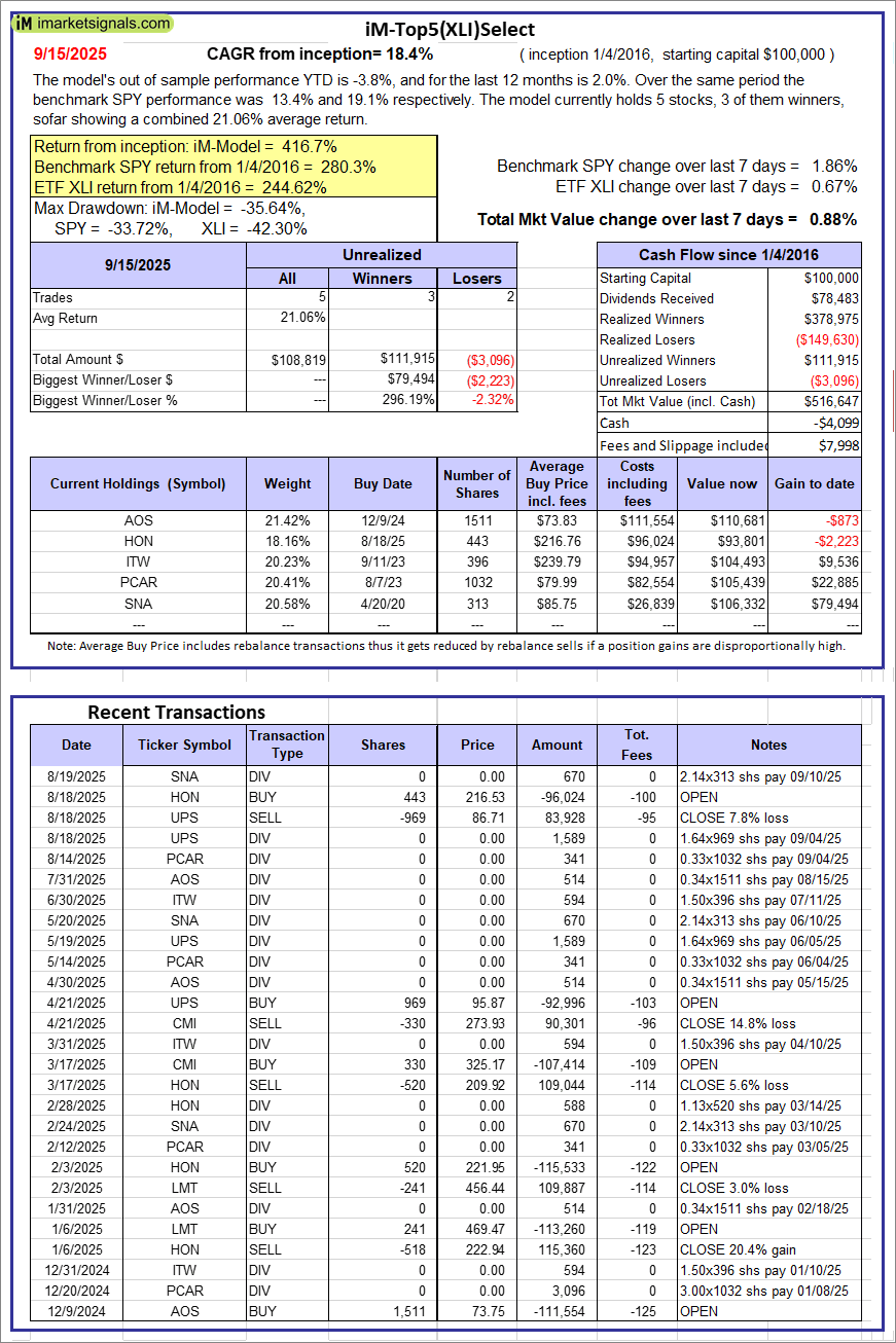 iM-Top5(XLI)Select: Since inception, on 1/5/2016, the model gained 416.65% while the benchmark SPY gained 280.32% over the same period. Over the previous week the market value of iM-Top5(XLI)Select gained 0.88% at a time when SPY gained 1.86%. A starting capital of $100,000 at inception on 1/5/2016 would have grown to $516,647 which includes -$4,099 cash and excludes $7,998 spent on fees and slippage. |