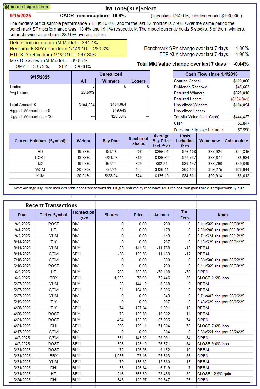iM-Top5(XLY)Select: Since inception, on 1/5/2016, the model gained 344.43% while the benchmark SPY gained 280.32% over the same period. Over the previous week the market value of iM-Top5(XLY)Select gained -0.44% at a time when SPY gained 1.86%. A starting capital of $100,000 at inception on 1/5/2016 would have grown to $444,427 which includes $1,847 cash and excludes $7,590 spent on fees and slippage. |