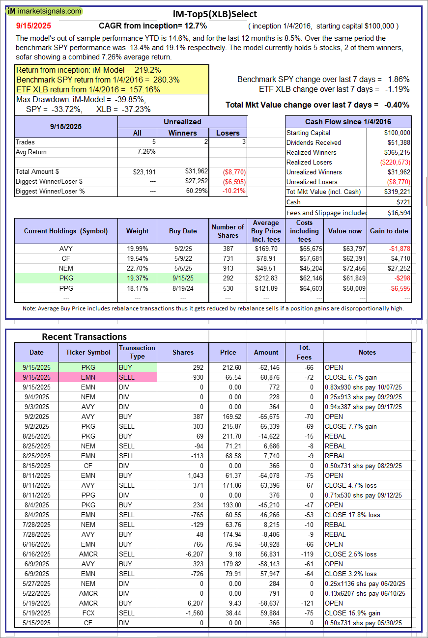 iM-Top5(XLB)Select: Since inception, on 1/5/2016, the model gained 219.22% while the benchmark SPY gained 280.32% over the same period. Over the previous week the market value of iM-Top5(XLB)Select gained -0.40% at a time when SPY gained 1.86%. A starting capital of $100,000 at inception on 1/5/2016 would have grown to $319,221 which includes $721 cash and excludes $16,594 spent on fees and slippage. |