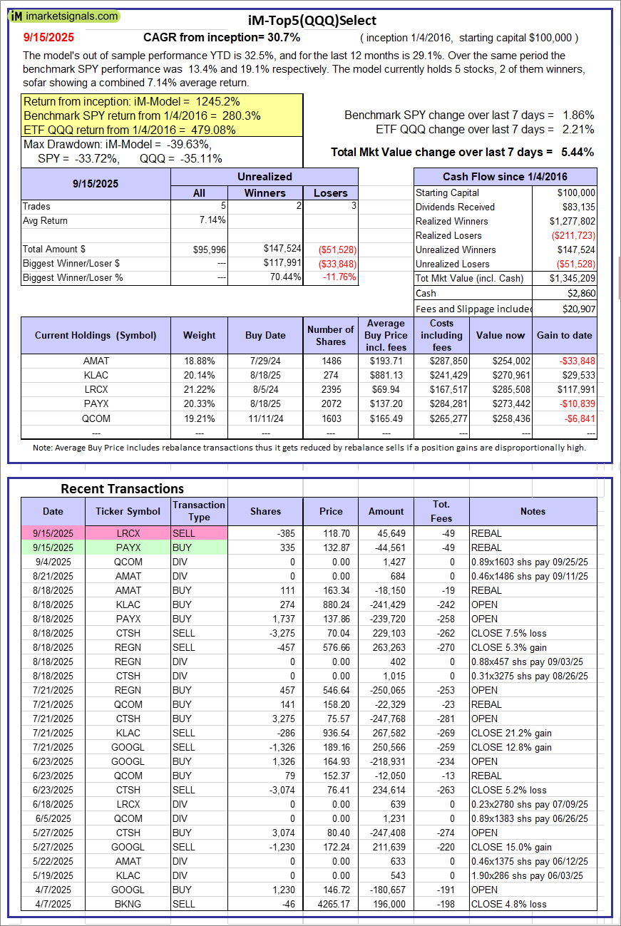 iM-Top5(QQQ)Select: Since inception, on 1/5/2016, the model gained 1245.21% while the benchmark SPY gained 280.32% over the same period. Over the previous week the market value of iM-Top5(QQQ)Select gained 5.44% at a time when SPY gained 1.86%. A starting capital of $100,000 at inception on 1/5/2016 would have grown to $1,345,209 which includes $2,860 cash and excludes $20,907 spent on fees and slippage. |