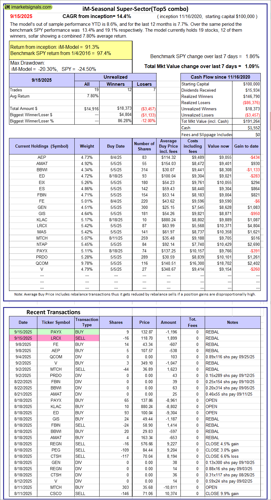 iM-Seasonal Super-Sectors (Top5 combo) : Since inception, on 11/17/2020, the model gained 91.26% while the benchmark SPY gained 97.42% over the same period. Over the previous week the market value of iM-Seasonal Super-Sectors (Top5 combo) gained 1.09% at a time when SPY gained 1.86%. A starting capital of $100,000 at inception on 11/17/2020 would have grown to $191,264 which includes $1,552 cash and excludes $00 spent on fees and slippage. |