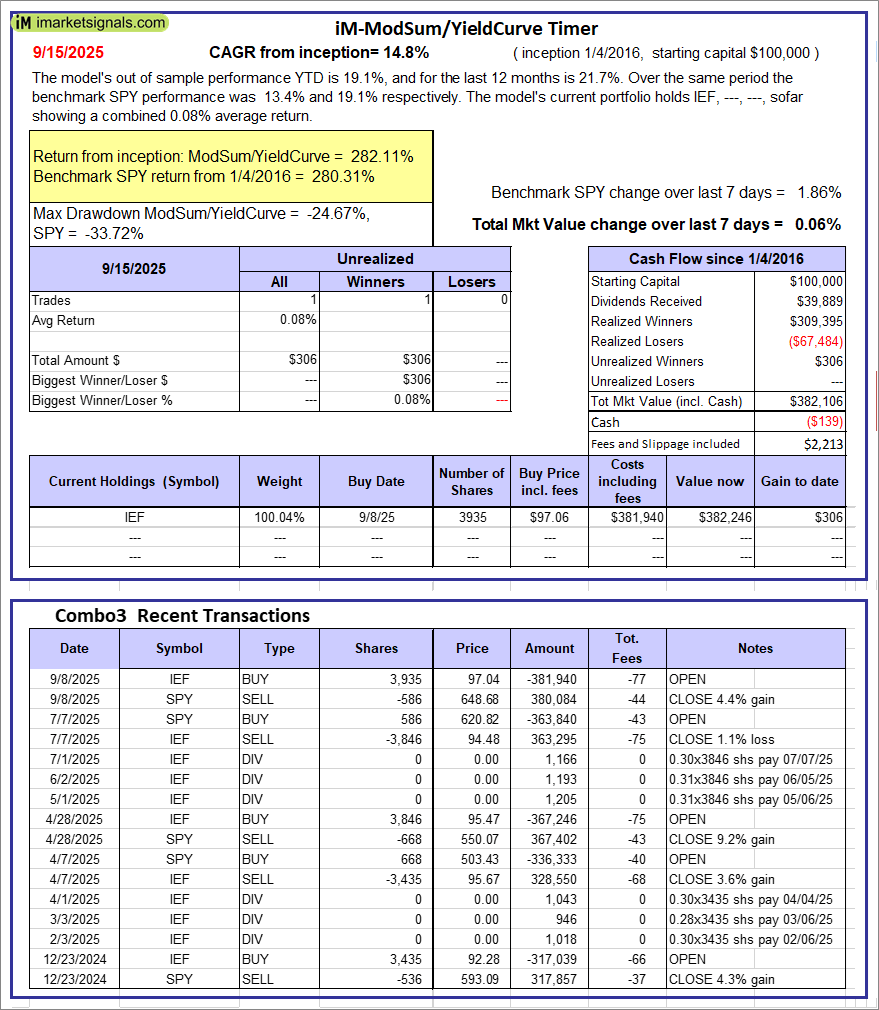iM-ModSum/YieldCurve Timer: The model’s out of sample performance YTD is 19.1%, and for the last 12 months is 21.7%. Over the same period the benchmark SPY performance was 13.4% and 19.1% respectively. Over the previous week the market value of iM-PortSum/YieldCurve Timer gained 0.06% at a time when SPY gained 1.86%. A starting capital of $100,000 at inception on 1/1/2016 would have grown to $382,106 which includes -$139 cash and excludes $2,213 spent on fees and slippage. |