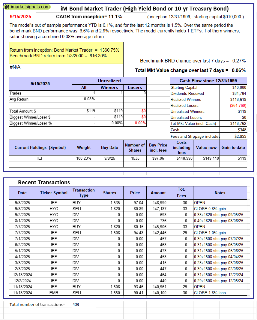 iM-Bond Market Trader (High-Yield Bond or 10-yr Treasury Bond): The model’s out of sample performance YTD is 6.1%, and for the last 12 months is 1.5%. Over the same period the benchmark BND performance was 6.6% and 2.9% respectively. Over the previous week the market value of the iM-Bond Market Trader (High-Yield Bond or 10-yr Treasury Bond) gained 0.06% at a time when BND gained 0.27%. A starting capital of $10,000 at inception on 1/3/2000 would have grown to $148,762 which includes -$348 cash and excludes $2,855 spent on fees and slippage. |