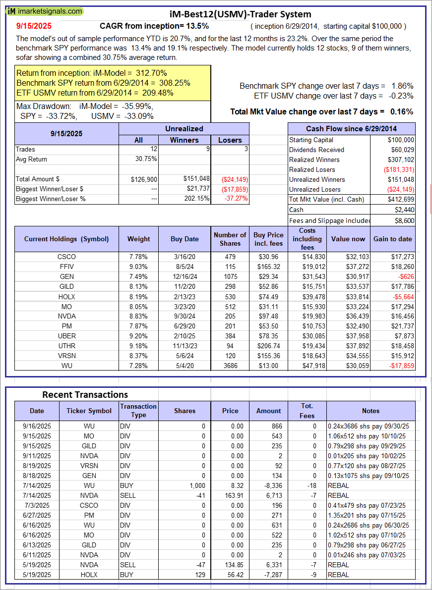iM-Best12(USMV)-Trader: The model’s out of sample performance YTD is 20.7%, and for the last 12 months is 23.2%. Over the same period the benchmark SPY performance was 13.4% and 19.1% respectively. Since inception, on 6/30/2014, the model gained 312.70% while the benchmark SPY gained 308.25% and the ETF USMV gained 209.48% over the same period. Over the previous week the market value of iM-Best12(USMV)-Trader gained 0.16% at a time when SPY gained 1.86%. A starting capital of $100,000 at inception on 6/30/2014 would have grown to $412,699 which includes $2,440 cash and excludes $8,600 spent on fees and slippage. |