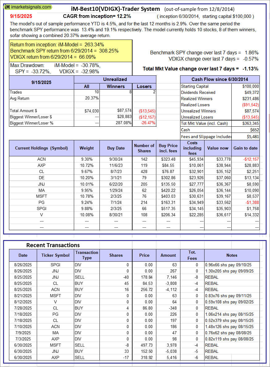 iM-Best10(VDIGX)-Trader: The model’s out of sample performance YTD is 4.5%, and for the last 12 months is 2.9%. Over the same period the benchmark SPY performance was 13.4% and 19.1% respectively. Since inception, on 7/1/2014, the model gained 263.34% while the benchmark SPY gained 308.25% and VDIGX gained 66.09% over the same period. Over the previous week the market value of iM-Best10(VDIGX) gained -1.13% at a time when SPY gained 1.86%. A starting capital of $100,000 at inception on 7/1/2014 would have grown to $363,345 which includes $652 cash and excludes $5,481 spent on fees and slippage. |