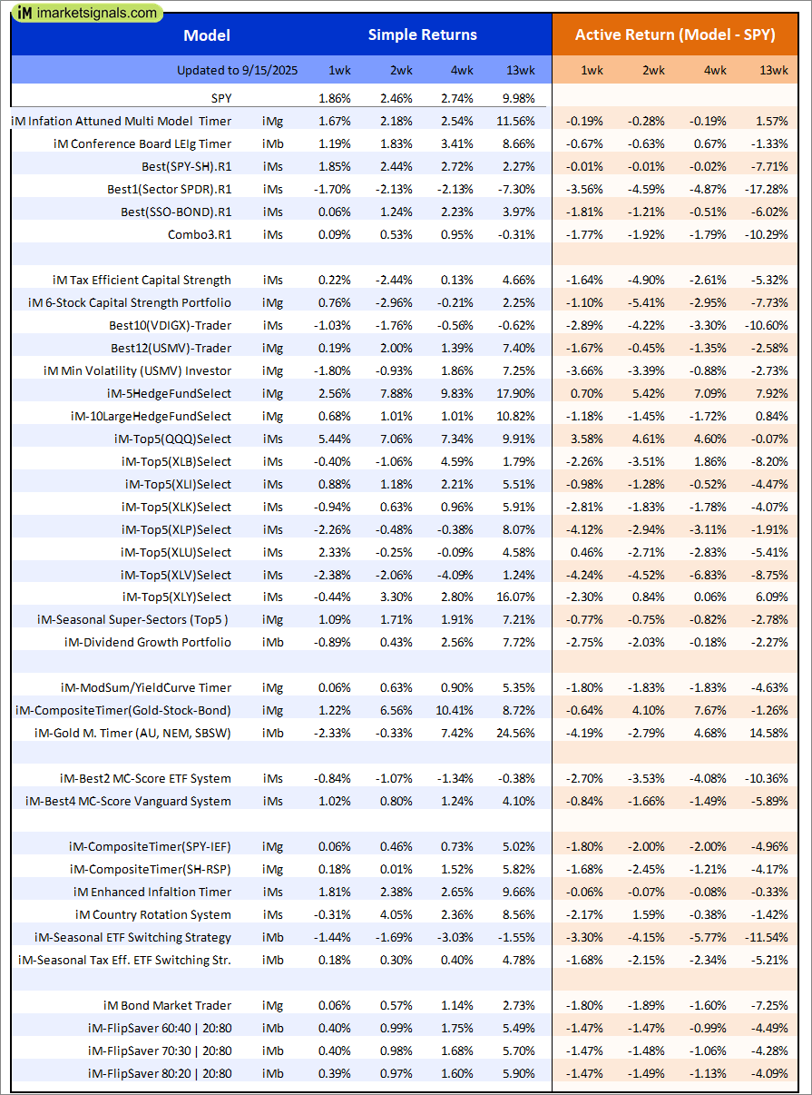 iM-Inflation Attuned Multi-Model Market Timer: The model’s out of sample performance YTD is 20.0%, and for the last 12 months is 27.6%. Over the same period the benchmark SPY performance was 13.4% and 19.1% respectively. Over the previous week the market value of the iM-Inflation Attuned Multi-Model Market Timer gained 1.68% at a time when SPY gained 1.86%. A starting capital of $100,000 at inception on 3/24/2017 would have grown to $148,355,029 which includes -$476,231 cash and excludes $3,953,990 spent on fees and slippage. |